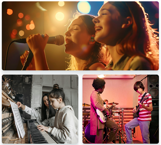 Great singing isn't just about hitting notes—it's about telling a story. Our vocal curriculum balances foundational technique with artistic expression, teaching students how to control their instrument while connecting emotionally to their music. From breathing exercises to performance coaching, we develop well-rounded vocalists who can adapt to any genre and own any stage.